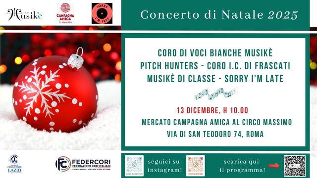 Sabato 13 dicembre alle ore 10.00 alcuni cori dell’APS Musikè si esibiranno per l’accensione dell’albero di Natale del Mercato Campagna Amica al Circo Massimo. Ecco il programma: