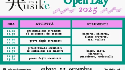 Sabato 13 settembre, ore 11.00/13.00, breve ma intenso Open Day della sede APS Musikè di via Gallia 98. Oltre alla possibilità di provare tantissimi strumenti si potrà parlare con i responsabili dei corsi collettivi e avere un servizio di consulenza per scegliere come intraprendere un percorso musicale in modo più consapevole. h 11.00/13.00 al piano terra: consulenza per la scelta…