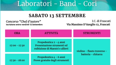 Cantare e/o suonare, da solo o in compagnia, fare musica è allegria! Vieni a scoprirlo sabato 13 Settembre dalle 17 alle 19, presso la sede di Frascati in via d’Azeglio 12. Potrai: provare e imparare a conoscere strumenti noti o meno partecipare come Chef al concorso più “dolce” che ci sia avere una consulenza personalizzata sul tuo percorso musicale ascoltare…
