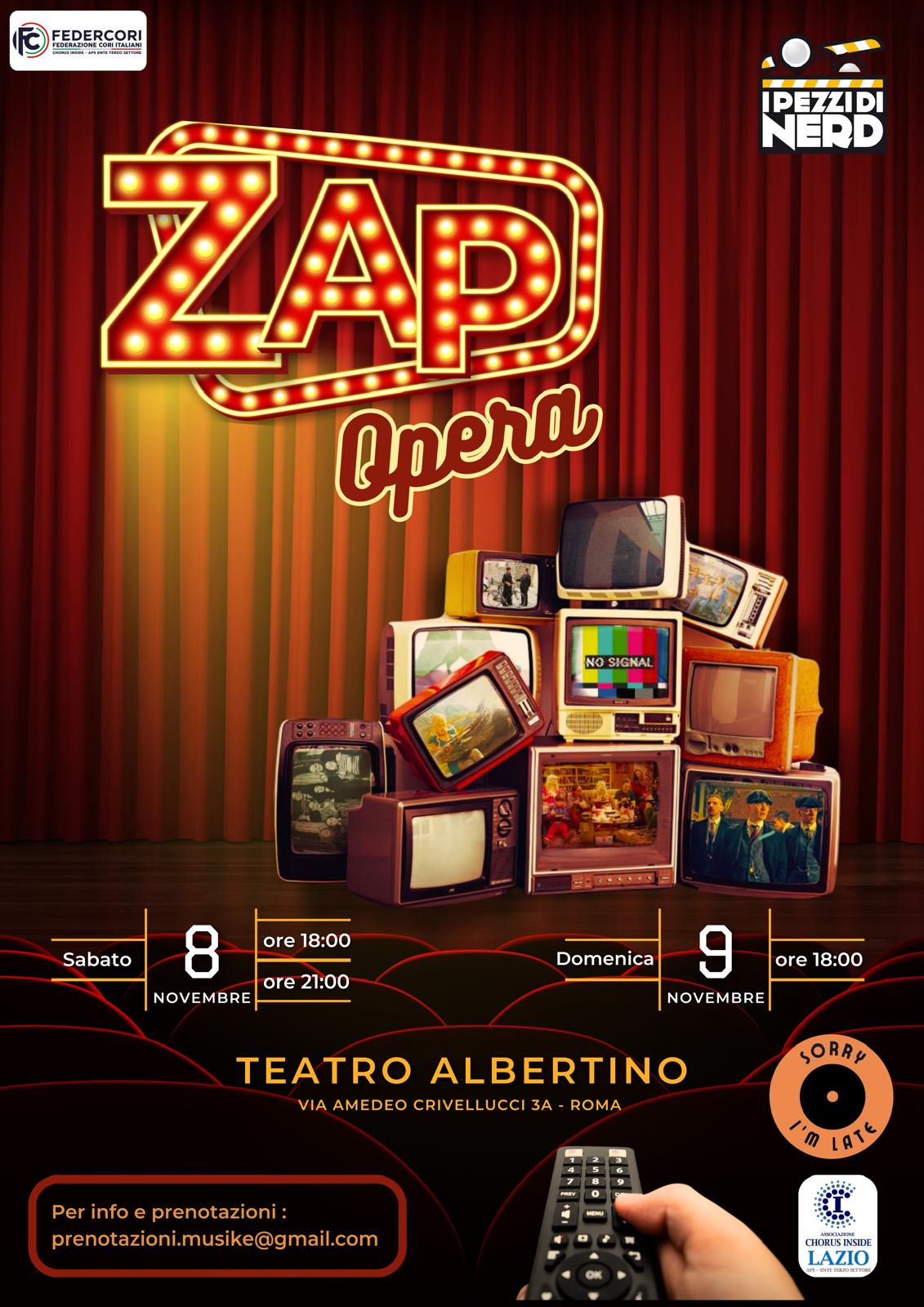 Zap Opera è una girandola sfrenata di musica e comicità. Alcune delle più iconiche sigle di serie TV verranno eseguite con energia contagiosa e arrangiamenti choral pop dai Sorry I’m Late, accompagnati per l’occasione da una band d’eccezione. Le sigle diventeranno l’innesco per gli esilaranti sketch comici dei Pezzi di Nerd e dei loro personaggi.